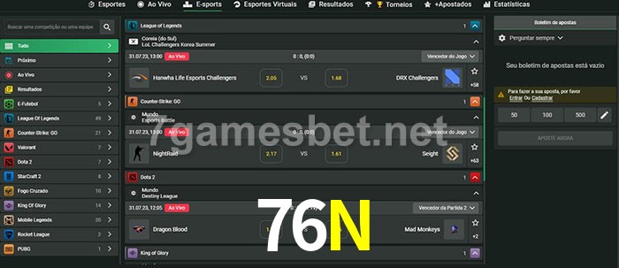 O 76N oferece uma grande seleção de opções de apostas em e-sports com probabilidades competitivas